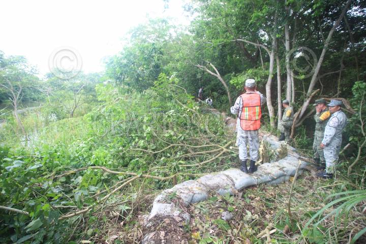 Ejército y Guardia Nacional colocaron costales con arena en las inmediaciones del río Grijalva ante un inminente desbordamiento en el poblado El Zapote