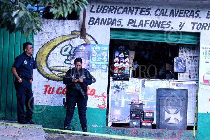 Dos policías de Cuernavaca resguardan el sitio donde fue asesinando el secretario de Bienes Comunales de Santa María Ahuacatitlan.