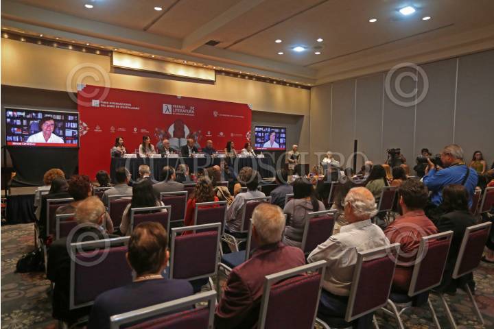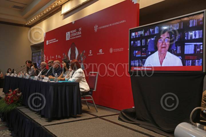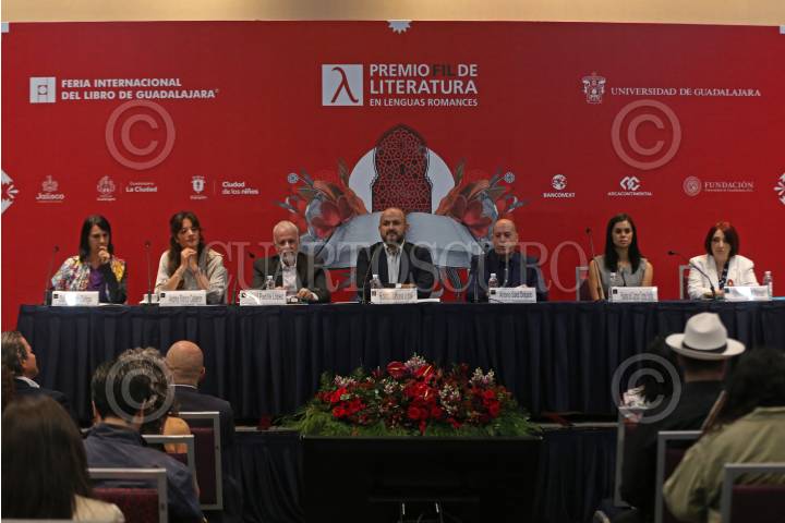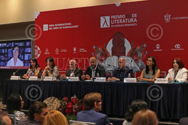 Autoridades de la Feria Internacional del Libro de Guadalajara (FIL), durante el anuncio del Premio FIL en Lenguas Romances, donde se dio a conocer a Mircea Cărtărescu escritor Rumano, como ganador del Premio.
