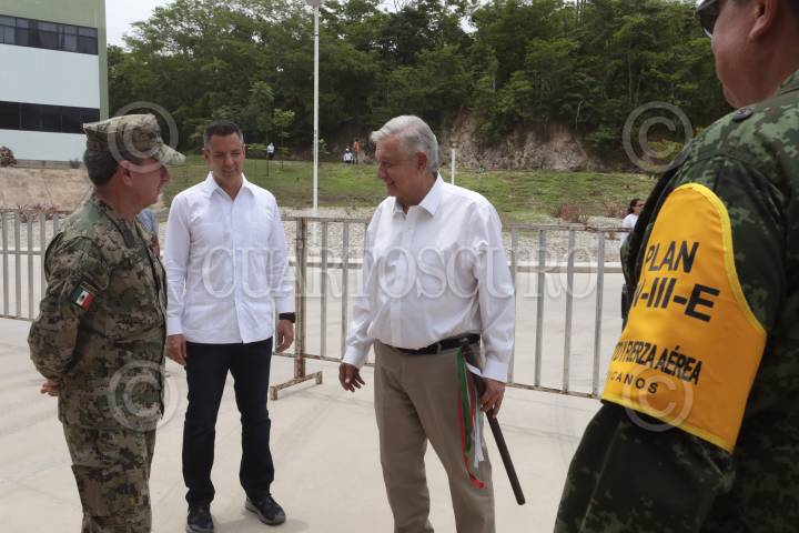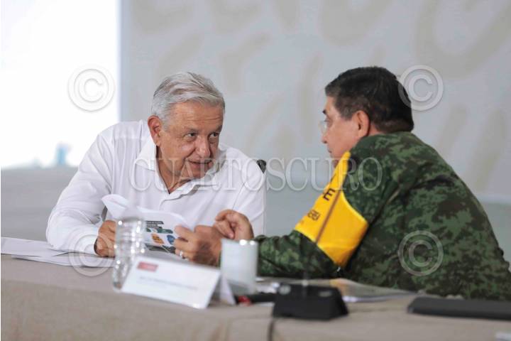 Rafael Ojeda; Alejandro Murat; Andrés Manuel López Obrador y Luis Cresencio Sandoval durante la presentación del Plan de apoyo a Población Afectada por el huracán Agatha en Oaxaca.