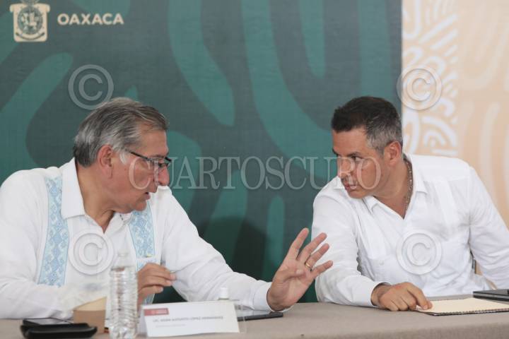 Adan Augusto López y Alejandro Murat durante la presentación del Plan de apoyo a Población Afectada por el huracán Agatha en Oaxaca.