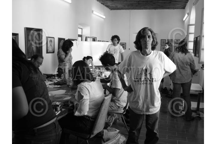FRESNILLO, ZACATECAS,15JULIO2009.- El Pintor Zacatecano Jesús Reyes Cordero egresado de la Escuela Nacional de Artes plásticas (ENAP) y de San Carlos y aprende pintura, grabado y dibujo, técnica de materiales con Gilberto Aceves Navarro, Tomás Parra, Ricardo Rocha, Francisco Moreno Capvilla, Luís Nishizawa y el taller de fotografía de Cati Horna y es uno de los integrantes del grupo SUMA a mediados de los setenta, imparte un curso en las instalaciones del Ágora, Centro Cultural, de esta ciudad para artistas plásticos y público interesado en conocer las técnicas. Reyes Cordero, maestro de la Universidad Autónoma de Zacatecas desde hace más de 20 años, imparte cursos en varios estados de la República. FOTO: ENRIQUE BARAJAS PRO/CUARTOSCURO.COM