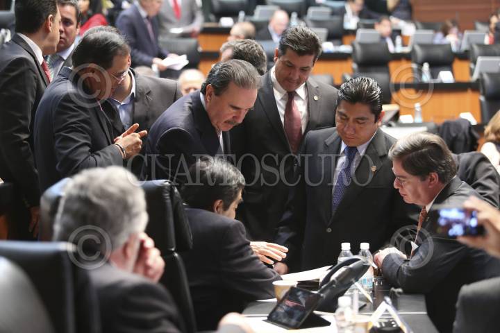 MÉXICO, D.F., 08ABRIL2014.- Los senadores Dolores Padierna, Ángel Benjamín Robles, Manuel Camacho Solís, Miguel Barbosa, coordinador PRD, Emilio Gamboa Patrón, coordinador del PRI y Jorge Luis Preciado, coordinador del PAN, durante la sesión en la Cámara de Senadores. FOTO: CUARTOSCURO.COM