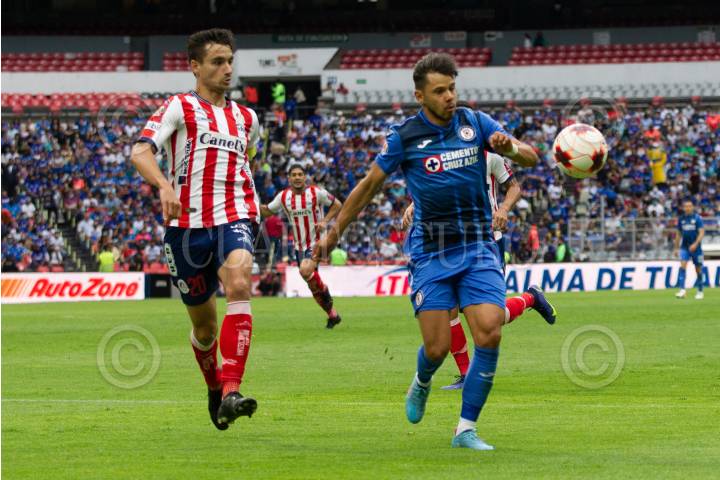 Unai Bilbau de Atlético San Luis y Ángel Romero de Cruz Azul durante el partido de fútbol correspondiente a la jornada 16 del torneo Clausura 2022 “Grita por la inclusión” de la Liga MX entre Cruz Azul vs Atlético San Luis en el Estadio Azteca.
