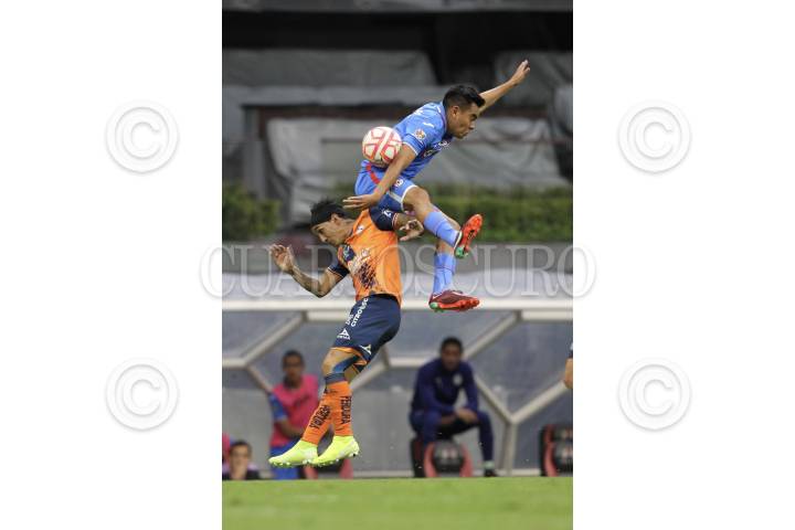Omar Fernández de Puebla y Ángel Romero del Cruz Azul disputan un balón durante el partido de fútbol Cruz Azul vs Puebla correspondiente a la jornada 4 del Torneo Apertura 2022 de Liga BBVA MX, en el estadio Azteca.