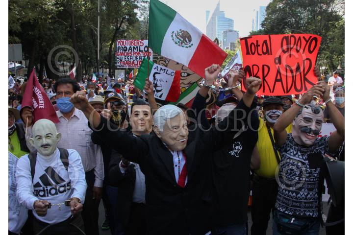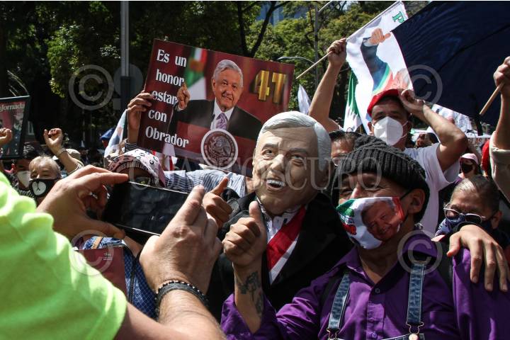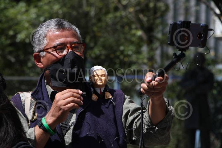 Un hombre con la máscara de AMLO se toma fotografías con los asistentes a la marcha.