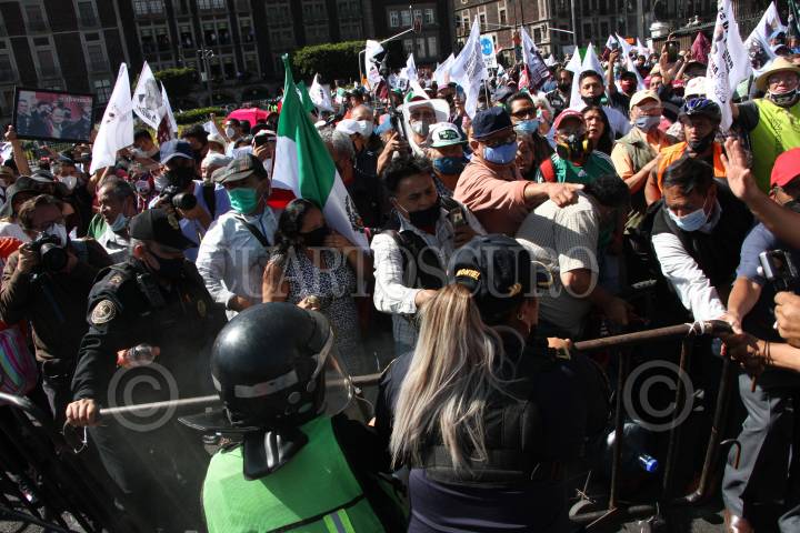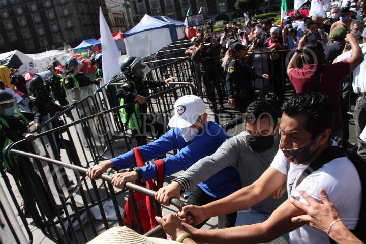 Simpatizantes de AMLO intentan tirar las vallas que protegen el campamento del FRENAAA.