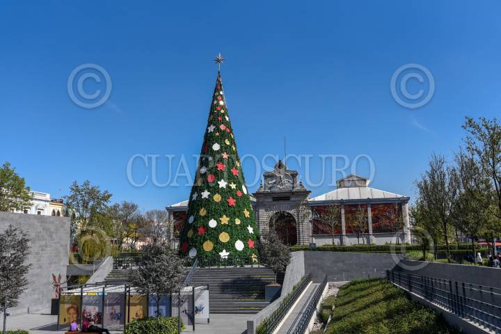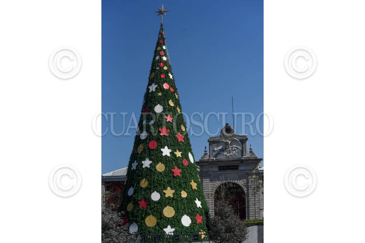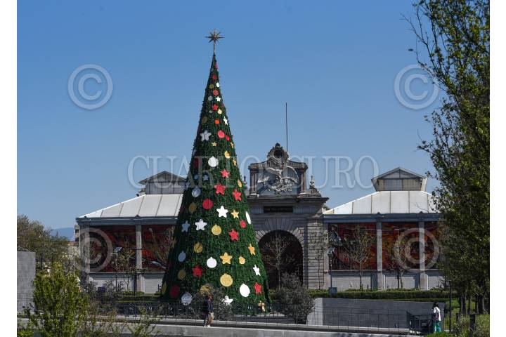 Un árbol de navidad gigante es parte de las atracciones que se encuentran en la romería instalada en las cercanias de la alcaldía Cuauhtémoc.
