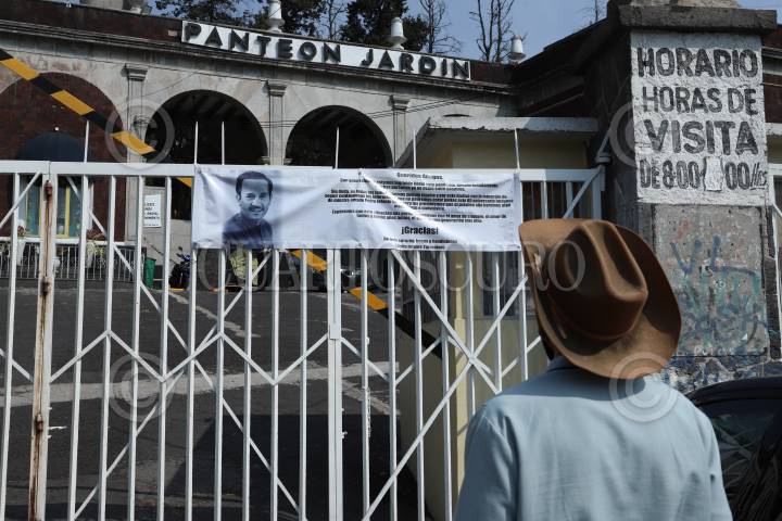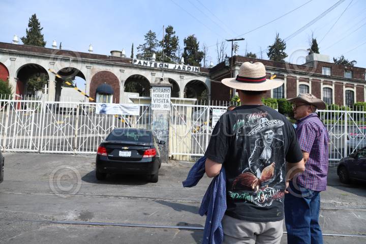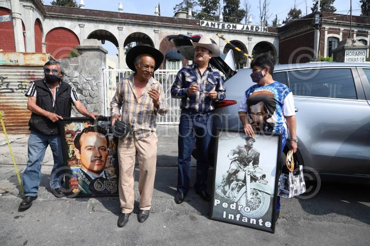 Admiradores de Pedro Infante se encontraron a las afueras del Panteón Jardín, tras encontrar una manta donde se lee que por motivos de la pandemia no es posible realizar los homenaje por el 65 aniversario luctuoso del Ídolo de Guamúchil.