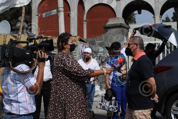 Medios de comunicación entrevistan a admiradores de Pedro Infante a las afueras del Panteón Jardín, tras encontrar una manta donde se lee que por motivos de la pandemia no es posible realizar los homenaje por el 65 aniversario luctuoso del Ídolo de Guamúchil.