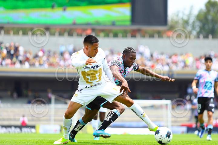 Oliver Pérez (Pumas) y Avilés Hurtado (Pachuca), durante el partido de la jornada 17 del torneo Grita México Clausura 2022 de la Liga BBVA MX.