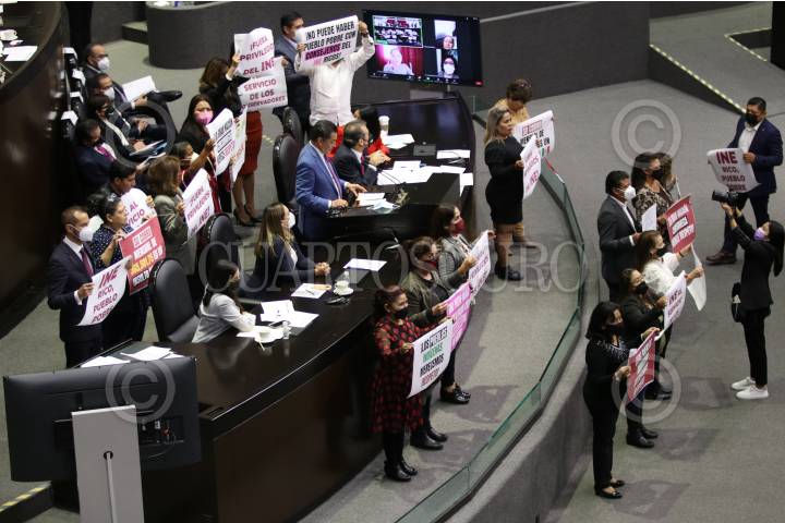 El diputado Oscar Cantón Zetina acompañado de diputados de la bancada de MORENA protestaron durante la comparecencia de Lorenzo Córdova, consejero presidente del INE, en el pleno de la Cámara de Diputados