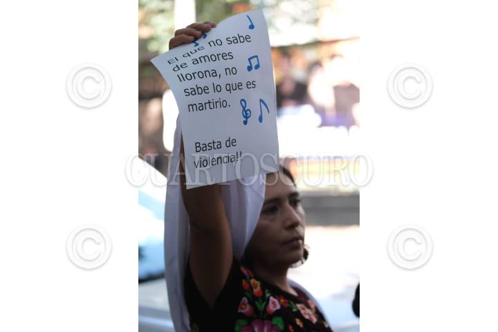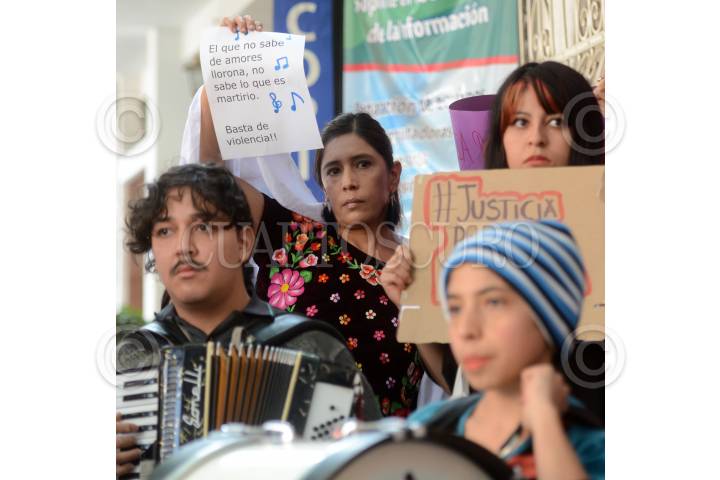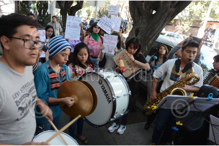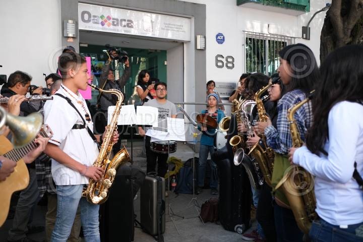 Músicos y mujeres de organizaciones feministas realizaron una manifestación en la que tocaron piezas instrumentales para exigir justicia por el ataque al la saxofonista mixteca María Elena Ríos.