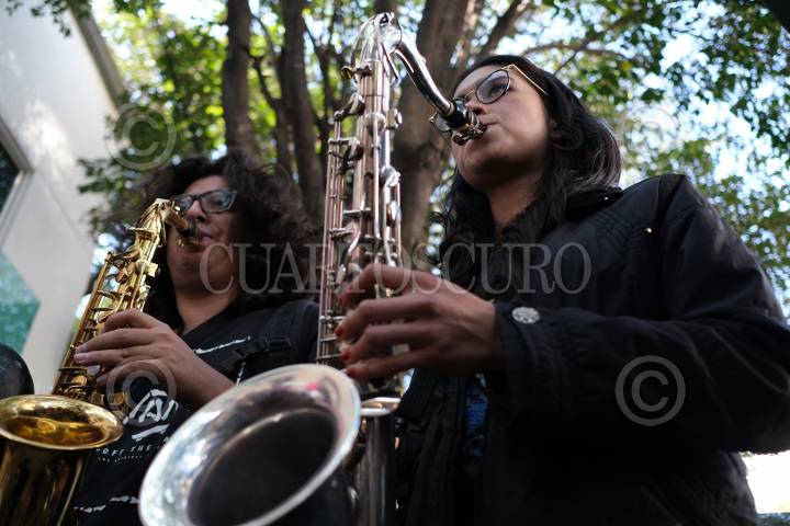 Músicos y mujeres de organizaciones feministasa realizaron una manifestación en la que tocaron piezas instrumentales para exigir justicia por el ataque a la saxofonista mixteca María Elena Ríos.