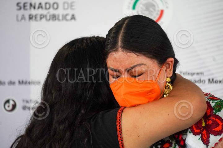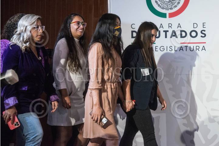 CIUDAD DE MÉXICO, 08FEBRERO2024.- Las activistas Maria Elena Ríos y Elisa Xolalpa, víctimas de ataques con ácido, celebraron en el Congreso de la Ciudad de México la aprobación de la llamada "Ley Malena", promovida por la diputada Marcela Fuentes Castillo. Este cambio jurídico integra los ataques con ácido a mujeres como tentativa de feminicidio y será castigado con hasta 12 años de cárcel. FOTO: GALO CAÑAS/CUARTOSCURO.COM