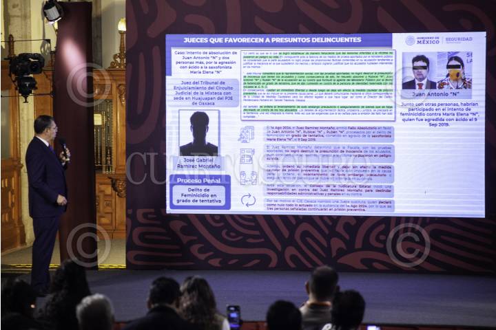CIUDAD DE MÉXICO, 20AGOSTO2024.- Luis Rodríguez Bucio, subsecretario de Seguridad Pública de la Secretaría de Seguridad y Protección Ciudadana (SSPC) durante conferencia matutina en Palacio Nacional. En la imagen muestra información del caso de la saxofonista María Elena Rios. FOTO: ANDREA MURCIA /CUARTOSCURO.COM