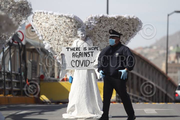 Persona disfrazadas de ángeles se apostaron en puente internacional Paso del Norte para mandar un mensaje de apoyo ante la crisis mundial por el Covid-19