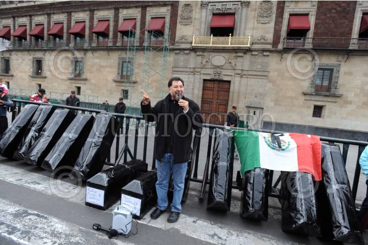 MÉXICO, D.F., 15ENERO2014.- Gerardo Gutiérrez Ñoroña quien pertenece a la organización Ánimo protesto con una veintena de ataúdes de cartón frente a Palacio Nacional por las muertes de civiles provocadas por la incursión militar y de policías federales a Michoacán para combatir al crimen organizado el cual controla varias regiones de ese estado, y para desarmar a las llamadas autodefensas. FOTO: MOISÉS PABLO /CUARTOSCURO.COM