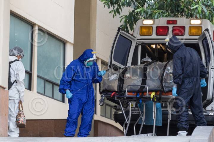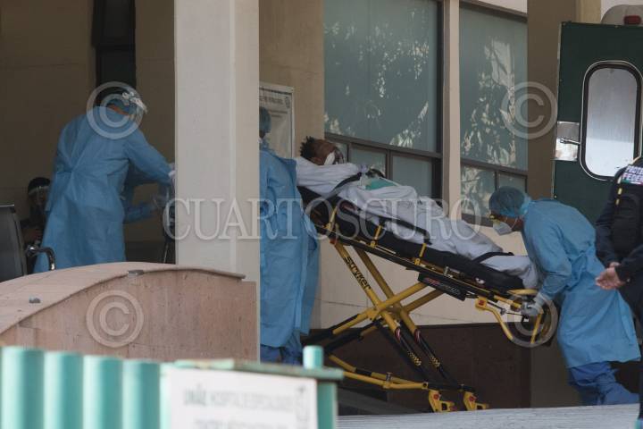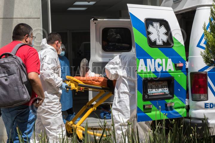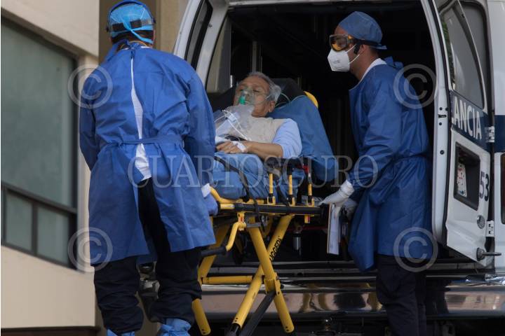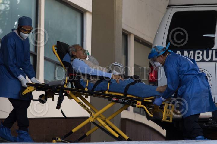 Una mujer de la tercera edad es bajada de una ambulancia por paramédicos para ser ingresa al área Covid-19 del Hospital General de México.