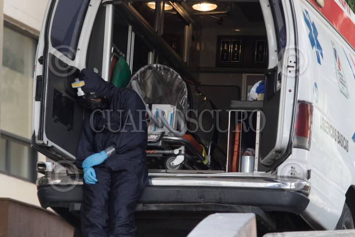 Un paramédico descansa en lo que le resuelven el ingreso del paciente con síntomas de Covid-19 que trasladó al Triage Respiratorio del Centro Médico Siglo XXI.