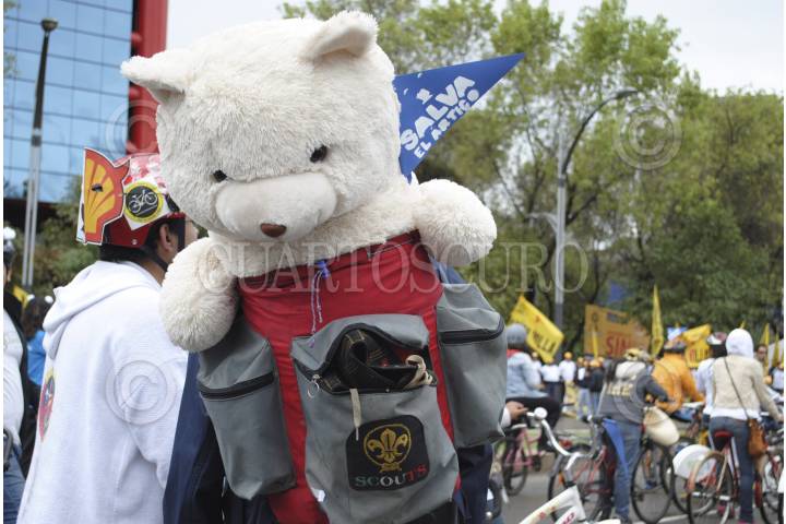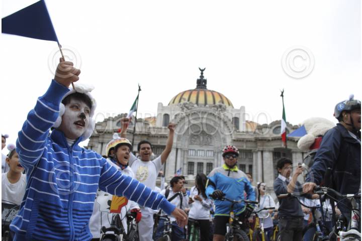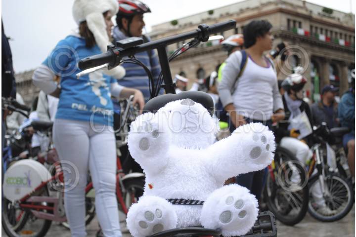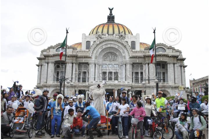 MÉXICO, D.F., 15SEPTIEMBRE2013.- Personas caracterizadas de osos polares participaron en la rodada ciclista en apoyo al movimiento global que tomara las calles para exigir la protección del Ártico y la salida de las empresas petroleras del ecosistema polar. La caravana partió de la glorieta de la palma al palacio de Bellas Artes. FOTO: MITZI BLANQUET /CUARTOSCURO.COM