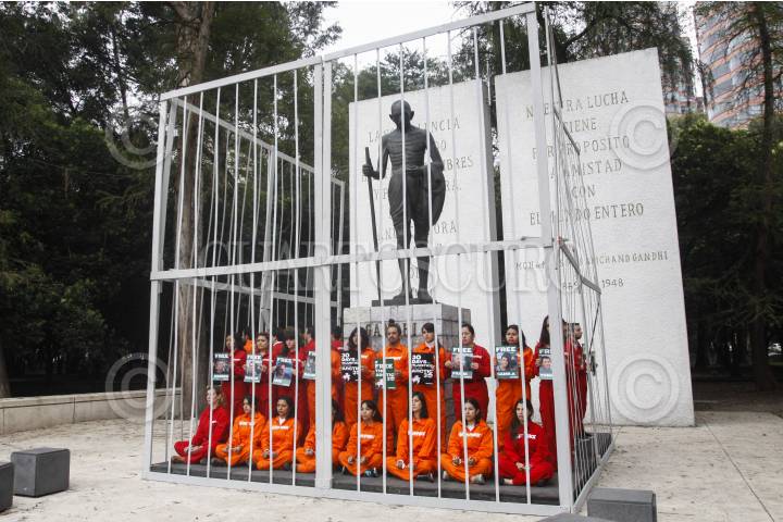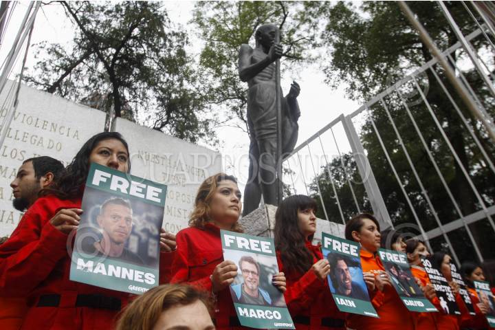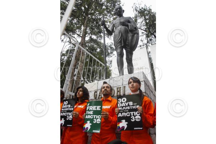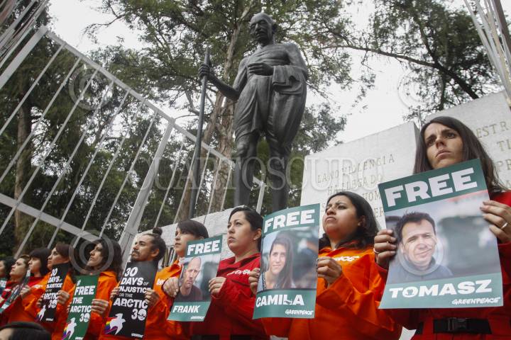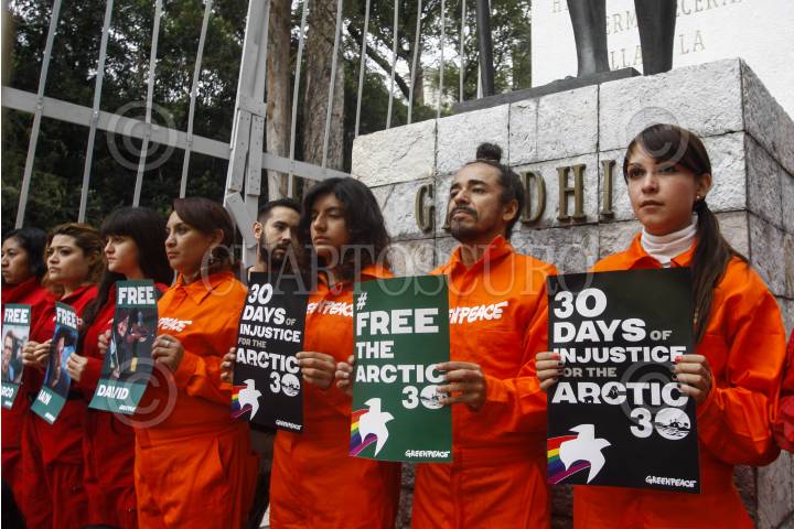 MÉXICO, D.F., 18OCTUBRE2013.- Integrantes de Greenpeace México, acompañado de Rubén Albarran, vocalista de Café Tacuva, realizaron en el Monumento a Gandhi un acto de solidaridad con los 28 activistas de la organización y 2 periodistas independientes que hoy cumplen 30 días de detención en Rusia, quienes son acusados por las autoridades de actos de piratería, luego de que intentaron realizar una protesta pacífica para denunciar los planes de una petrolera de aquel país en el Ártico. FOTO: RODOLFO ANGULO /CUARTOSCURO.COM