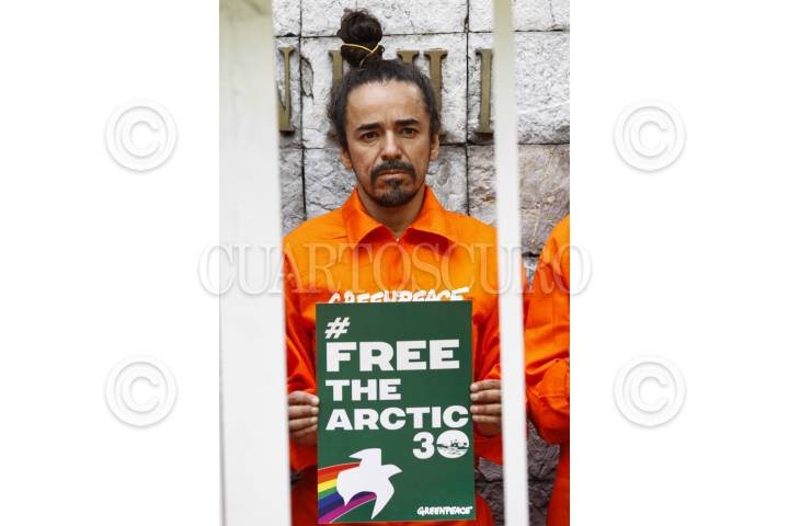 MÉXICO, DF, 16NOVIEMBRE2013.-La organización ambientalista Greenpeace realizó un performance en la explanada del Palacio de Bellas Artes, cuyo motivo principal fue exigir la liberación de 30 activistas de su misma organización los cuales fueron apresados el pasado 18 de septiembre, cuando intentaron escalar la plataforma de la firma petrolera rusa Gazprom con el fin de colgar un mensaje en contra de la perforación petrolera en el Ártico. FOTO: PEDRO ANZA /CUARTOSCURO.COM