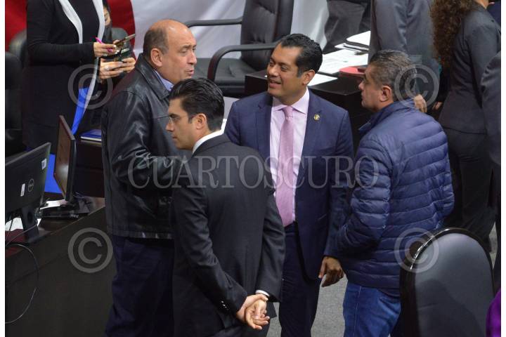 Sergio Gutiérrez, presidente de la mesa directiva, dialoga con los coordinadores parlamentarios: Rubén Moreira (PRI); Jorge Romero (PAN) y Luis Espinosa Cházaro (PRD), durante la sesión ordinaria de la Cámara de Diputados.
