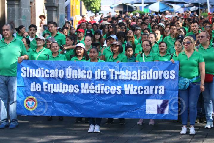 CUERNAVACA, MORELOS, 01MAYO2024.- Trabajadores del Sindicato Único de Trabajadores de Equipos Médicos Vizcarra, marchan por el centro histórico de la capital de Morelos, por la conmemoración del Día del Trabajo. Miles de trabajadores agrupados en sindicatos realizaron marchas para conmemorar la lucha de los asalariados por mejores condiciones laborales y de vida. FOTO: MARGARITO PÉREZ RETANA/CUARTOSCURO.COM