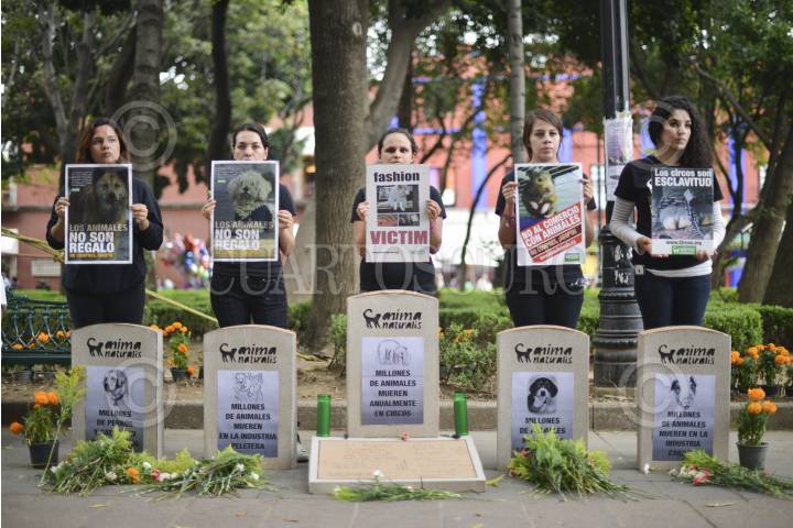 MÉXICO, D.F., 01NOVIEMBRE2013.- Activistas de AnimaNaturalis colocaron 5 lápidas simbólicas representando a todos los animales que mueren debido a los hábitos de consumo humanos. Asimismo, se conmemoraron el Día Mundial del Veganismo. La manifestación fue realizada en el jardín Hidalgo del centro de Coyoacán. FOTO: ADOLFO VLADIMIR /CUARTOSCURO.COM
