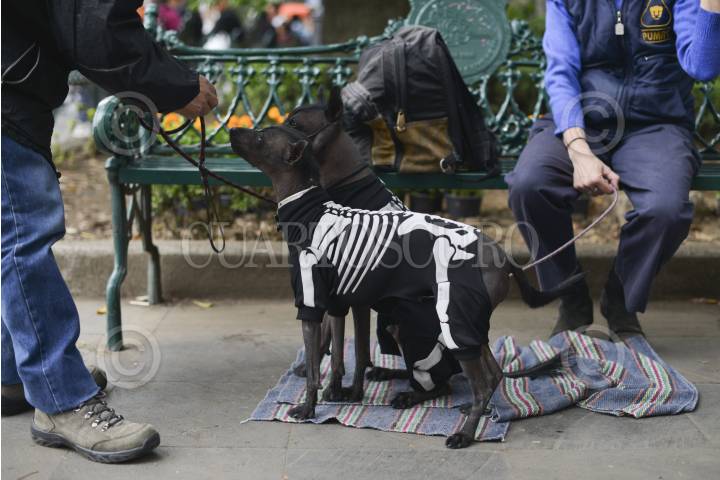 MÉXICO, D.F., 01NOVIEMBRE2013.- En el jardín Hidalgo del centro de Coyoacán cientos de familias salieron a disfrutar de la mañana, algunos todavía con sus disfraces de la noche anterior. En la imagen, dos Xoloitzcuintles con disfraz de calavera. FOTO: ADOLFO VLADIMIR /CUARTOSCURO.COM