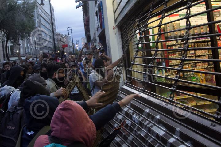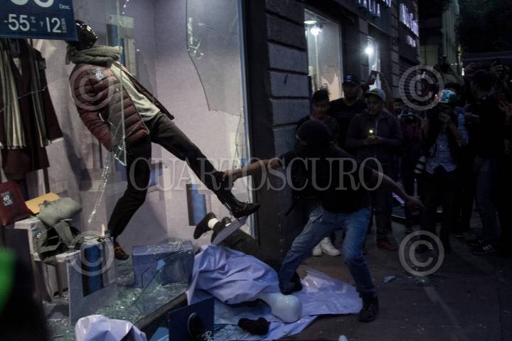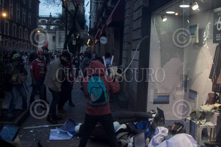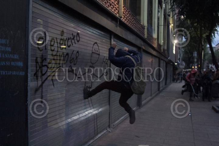 CIUDAD DE MÉXICO, 02OCTUBRE2018.- Miles de personas marcharon de la plaza de las tres culturas rumbo al Zócalo capitalino con motivo de la marcha del 50 aniversario de la matanza del 02 de octubre. Posteriormente, sobre la avenida 5 de Mayo un grupo de anarquistas realizaron pintas, ruptura de vidrios e incluso la extracción de artículos de dos comercios. FOTOS: RODRIGO RUBIO /CUARTOSCURO.COM
