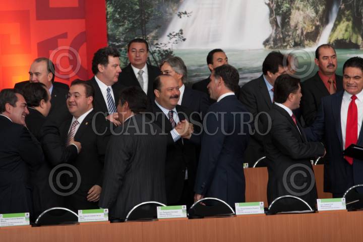 MÉXICO, D.F., 28FEBRERO2011.- Carlos Lozano, Gobernador de Aguas Calientes, Carlos Ramírez Marín, Diputado del PRI, Fernado Ortega Bárnes, Gobernador de Campeche, César Duarte Jaques, Gobernador de Chiuahua, Gabino Cue, Gobernador de Oaxaca, Malova Mario López, Gobernador de Sinaloa, durante la ceremonia de Firma del Acuerdo Nacional de Turismo que fue firmado en Palacio Nacional. FOTOS: GUILLERMO PEREA /CUARTOSCURO.COM