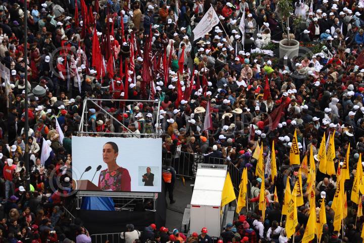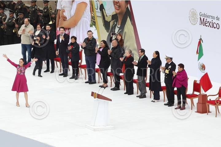 CIUDAD DE MÉXICO, 12ENERO2025.- Claudia Sheinbaum, presidenta de México, acompañada por los integrantes de su gabinete y miles de simpatizantes, ofreció un discurso por los 100 días de su mandato, en el cual enumeró los logros que ha conseguido su administración en ese periodo de tiempo. FOTO: DANIEL AUGUSTO/ CUARTOSCURO.COM