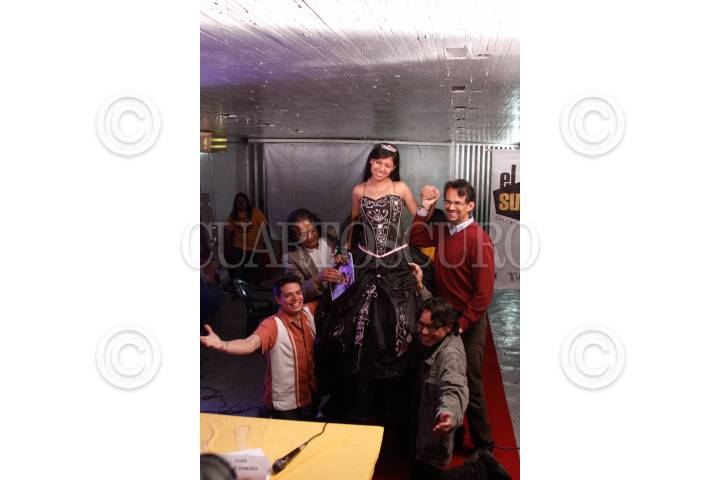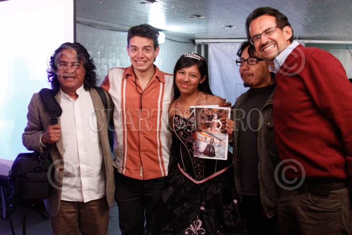 MEXICO, D.F., 16DICIEMBRE2010.- El número 105 de la revista Cuartoscuro fue presentado en la galería "EL SUB" ubicado en la calle 20 de noviembre en el centro histórico. Hermes Quetzalcóatl, fotógrafo; Pedro Valtierra, director de la revista Cuartoscuro; Javier Hidalgo, director de Intituto de la Juventud; y Juan Pablo Zamora, fotógrafo; posaron junto con una de las quinceañeras que participaron en las quinceañeras bicentenario, exposición que se inauguró en el lugar. FOTO: IVAN STEPHENS/CUARTOSCURO.COM