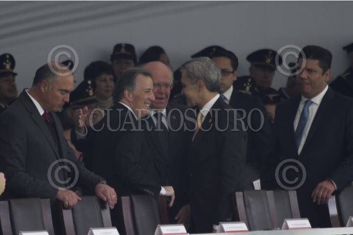 CIUDAD DE MÉXICO, 20NOVIEMBRE2016.- José Antonio Meade, secretario de Hacienda, y Miguel Ángel Mancera, Jefe de Gobierno, conversan en la ceremonia del 106 aniversario de la Revolución Mexicana en el Campo Marte. FOTO: MOISÉS PABLO /CUARTOSCURO.COM