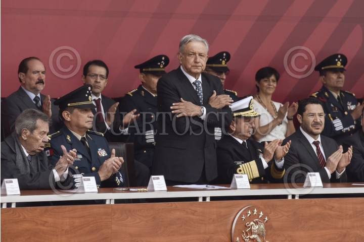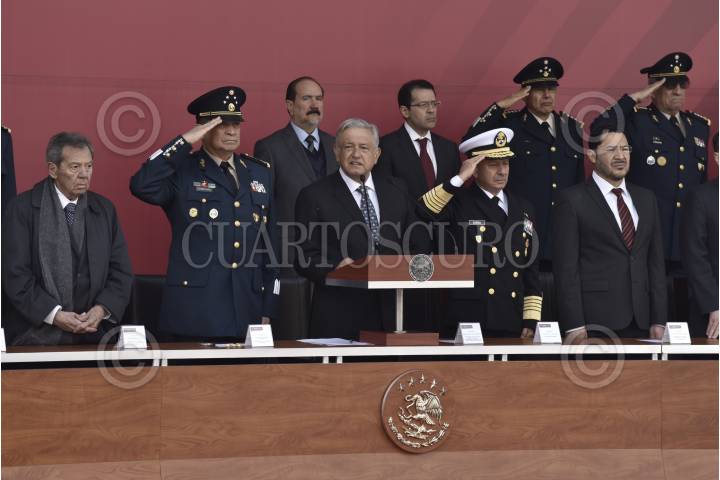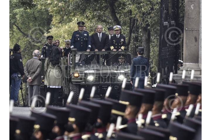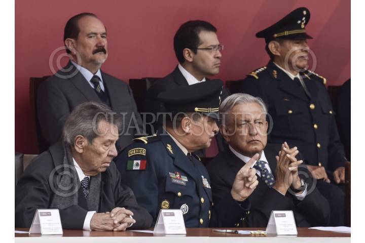 CIUDAD DE MÉXICO, 09FEBRERO2019.- Andrés Manuel Lopez Obrador, presidente de México, encabezó la Marcha de la Lealtad en su 106 Aniversario, llevada a cabo en el patio principal del Castillo de Chapultepec. En la imagen Porfirio Muñoz Ledo, presidente de la mesa directiva de la Cámara de Diputados, Luis C. Sandoval, secretario de Defensa, José Rafael Ojeda, secretario de Marina, y Martí Batres, presidente del Senado, acompañaron al presidente Andrés Manuel López Obrador. FOTO: MARIO JASSO /CUARTOSCURO.COM