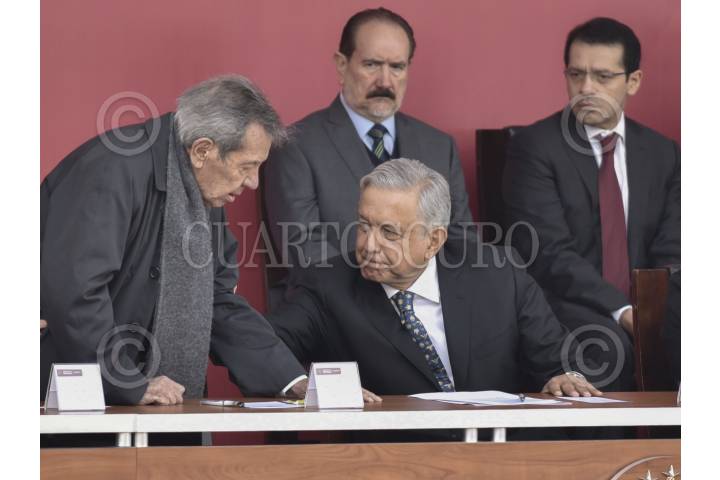 CIUDAD DE MÉXICO, 09FEBRERO2019.- Andrés Manuel López Obrador, presidente de México, encabezó la Marcha de la Lealtad en su 106 Aniversario, llevada a cabo en el patio principal del Castillo de Chapultepec. En la imagen, Porfirio Muñoz Ledo, presidente de la mesa directiva de la Cámara de Diputados junto al presidente Andrés Manuel López Obrador. FOTO: MARIO JASSO /CUARTOSCURO.COM