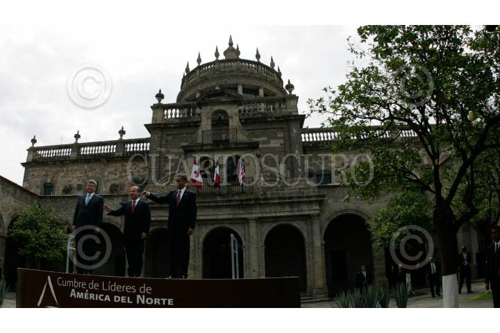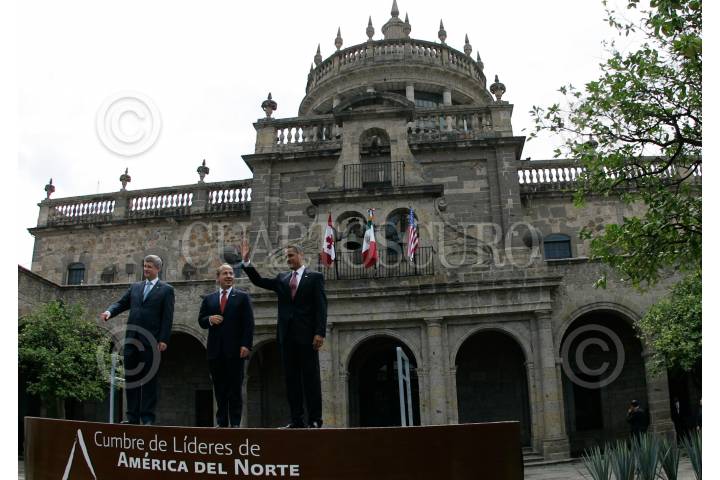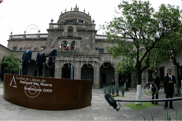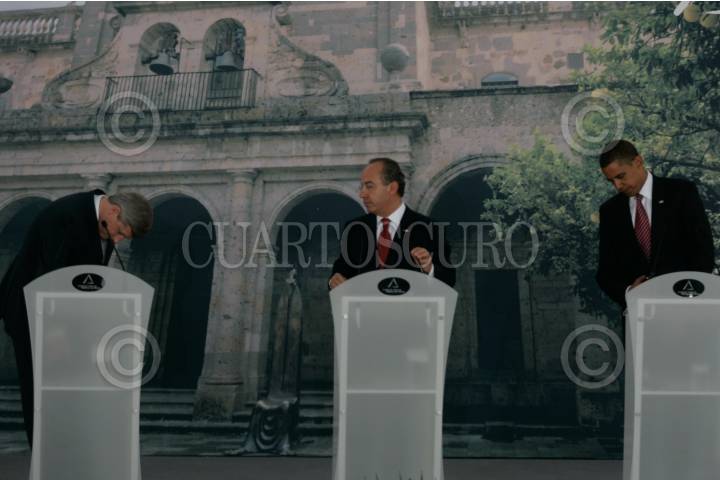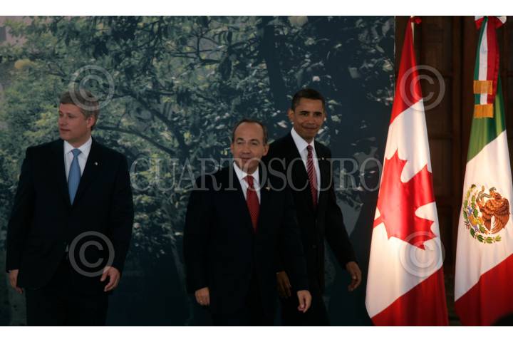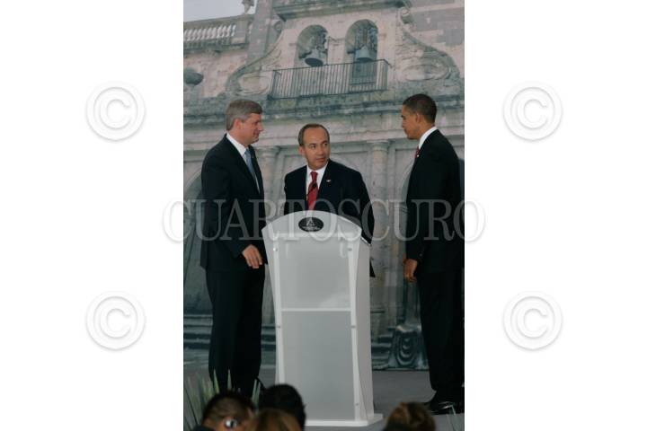 GUADALAJARA, JALISCO 10AGOSTO 2009.- Fotografia oficial de los presidentes Los presidentes de México, Felipe Calderón de EU, Barack Obama y el primer ministro de Canadá, Stephen Harper FOTO: SÁSHENKA GUTIERREZ/CUARTOSCURO.COM