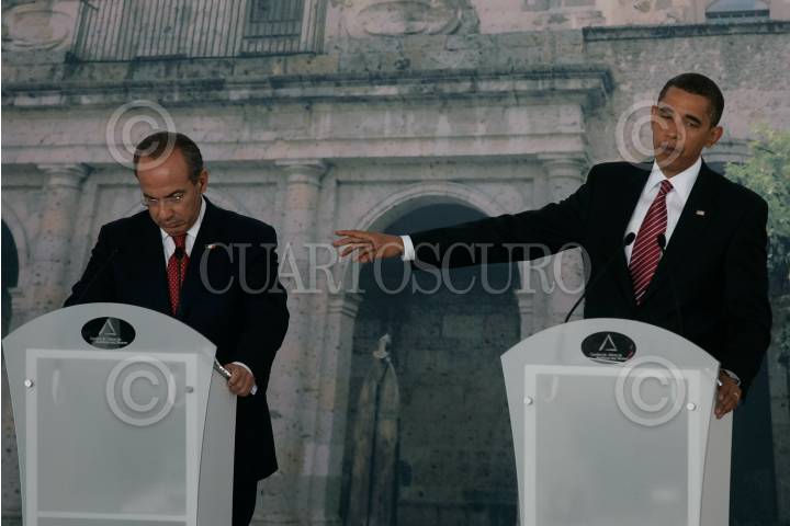 GUADALAJARA, JALISCO 10AGOSTO2009.- Conferencia de prensa conjunta de los presidentes de México, Felipe Calderón; y de Estados Unidos, Barack Obama; al termino de la reunión trilateral en el Instituto Cultural Cabañas. FOTO: SÁSHENKA GUTIERREZ/CUARTOSCURO.COM