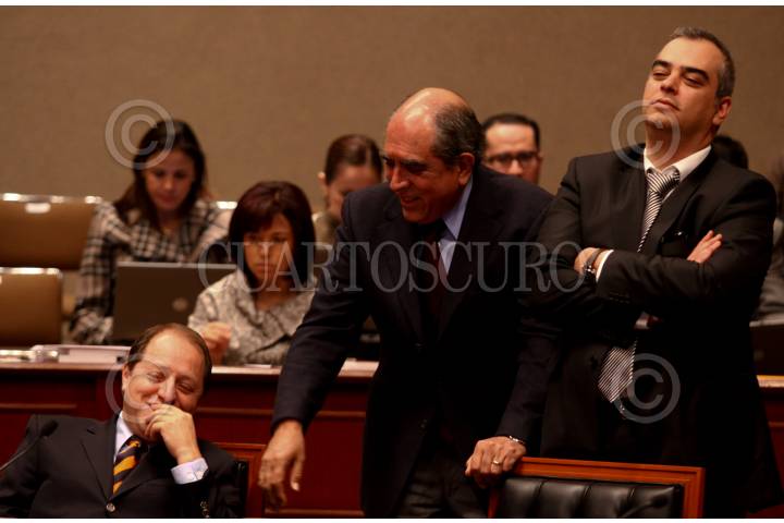MÉXICO, D.F., 10JULIO2009.-Los consejeros Marco Antonio Baños, Pablo Gomez senador del sol azteca, Alfredo Figueroa conversan durante la Sesion Extraordinaria del Consejo General del Instituto Federal Electoral FOTO:SÁSHENKA GUTIÉRREZ/CUARTOSCURO.COM