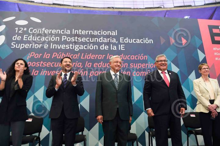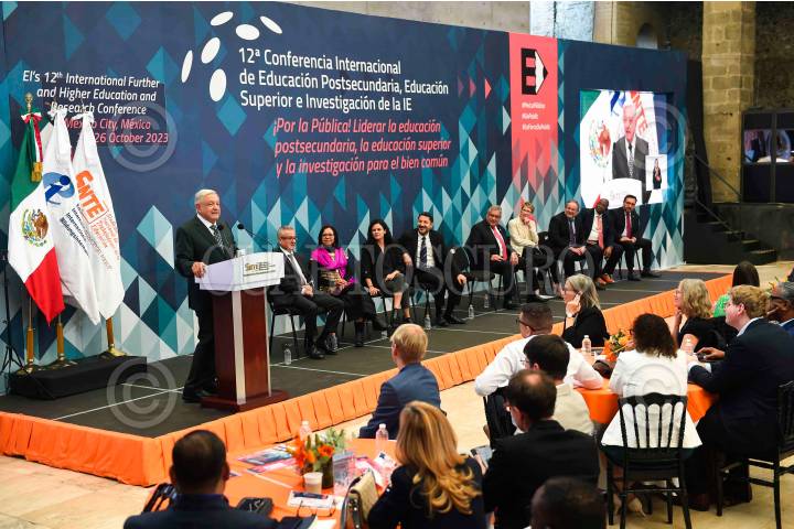 CIUDAD DE MÉXICO. 24OCTUBRE2023.- Andrés Manuel López Obrador, presidente de México en la Inauguración de la 12° Conferencia Internacional de Educación Postsecundaria, Superior e Investigación. Lo acompañan: Martí Batres Guadarrama, jefe de Gobierno de la Ciudad de México; Luisa María Alcalde Luján, secretaria de Gobernación; Leticia Ramírez Amaya, secretaria de Educación Pública; Oscar Flores Jiménez, titular de la Unidad de Administración y Finanzas de la Secretaría de Educación Pública; Susan Hopgood, presidenta de la Internacional de Educación (IE); Mugwena Maluleke, vicepresidente para África del Comité Ejecutivo de la Internacional de la Educación (IE) y secretario general de la Unión Africana Sur del Magisterio Democrático; Arturo Reyes Sandoval, director del Instituto Politécnico Nacional; David Edwards, secretario general de la Internacional de Educación (IE); Alfonso Cepeda Salas, secretario general del Sindicato Nacional de Trabajadores de la Educación. FOTO: PRESIDENCIA/CUARTOSCURO.COM