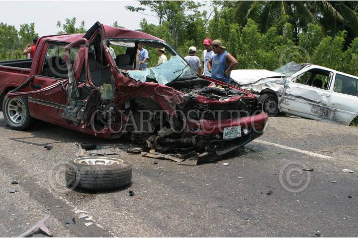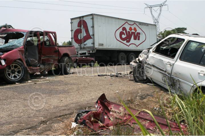 CUNDUACAN, TABASCO, 11MAYO2006.- Sobre el kilometro 152 de la carretera federal Villahermosa, Cardenas se registró un accidente automovilistico, al fallarle los frenos a un camión tipo trailer de la empresa AYVI, donde arrastro con dos vehiculos, provocando que seis personas resultaran gravemente heridas. FOTO: Marco Polo Guzmán Hernández/CUARTOSCURO.COM