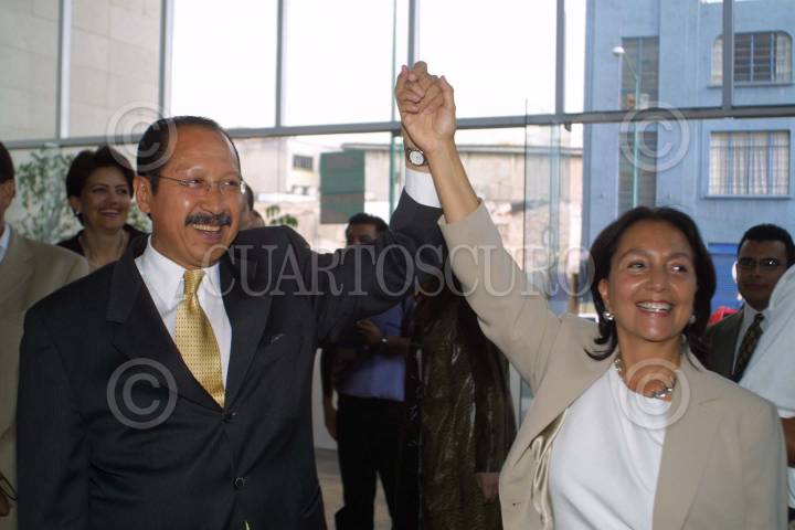 México, D.F., 09JULIO2004.- El V Consejo Nacional continuación del 16º Pleno Ordinario del PRD se realiza reuniendo a los miembros de su consejo polítco. En la imagen, Leonel Godoy, presidente del partido levanta la mano de Amalia García Medina, gobernadora electa de Zacatecas. FOTO: Brenda Magaly/CUARTOSCURO.COM