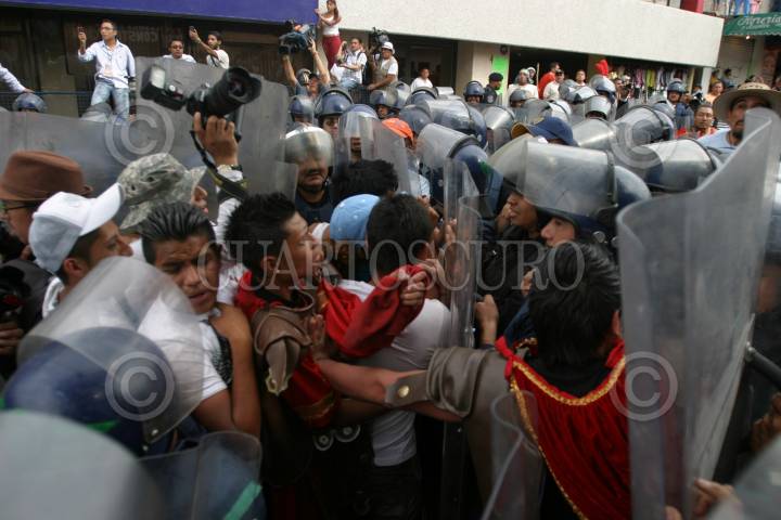 MÉXICO, D.F., 02ABRIL2010.- Tras una trifulca en el último tramo del recorrido del nazareno en la representación de la Pasión de Cristo en su edición 167, que impidió por unos momentos el paso de Jesús, luego de los que los vecinos que lo acompañaban intentaron subir al Cerro de la Estrella y los granaderos les impidieron el paso lo que causo confusión y escudazos por parte de los elementos de seguridad. FOTO: MOISÉS PABLO/CUARTOSCURO.COM