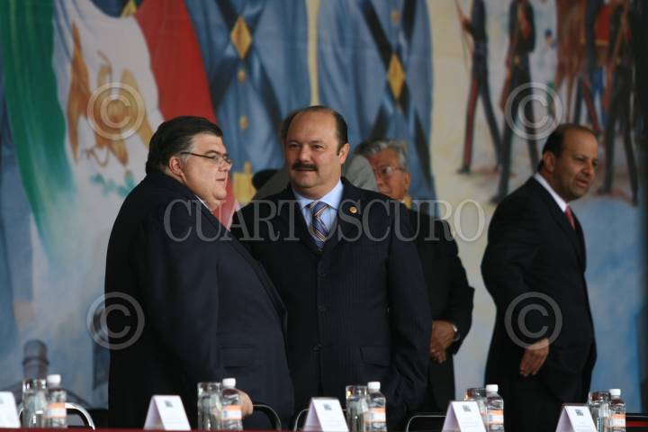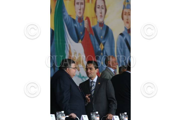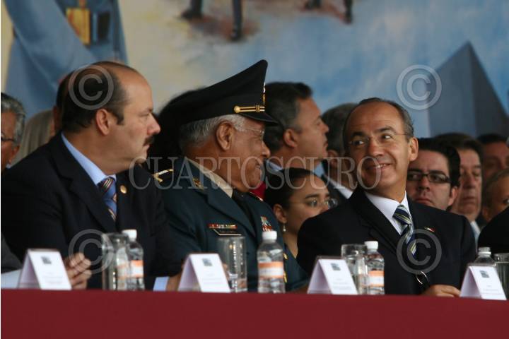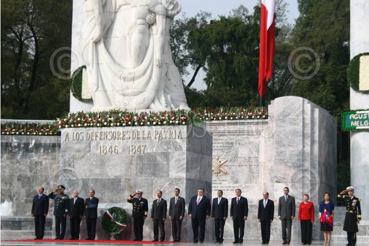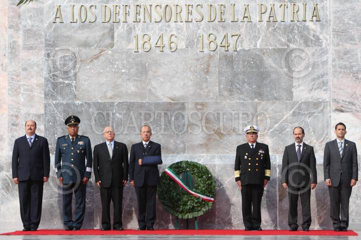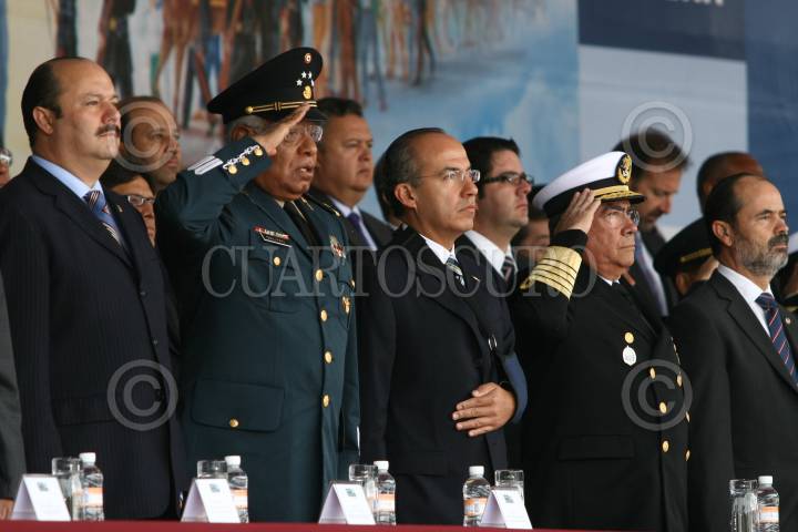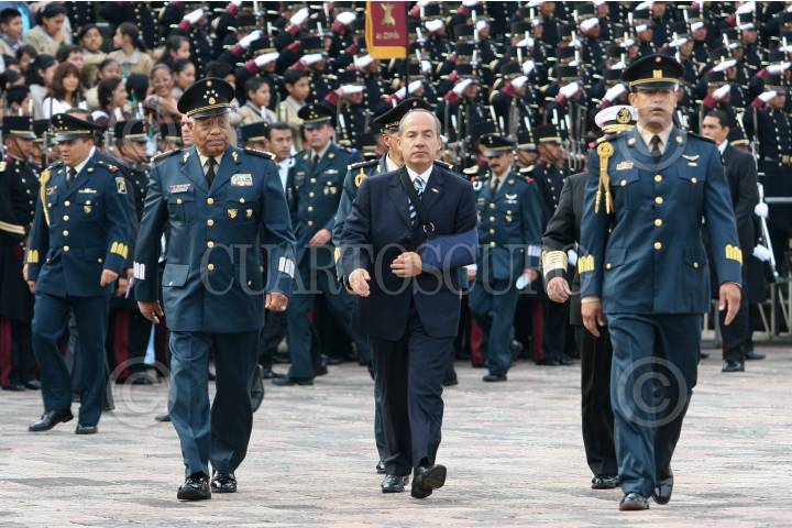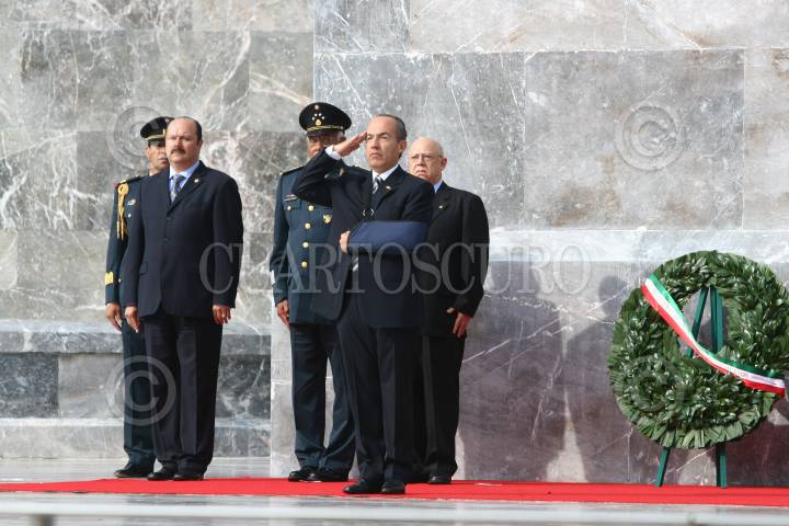 MÉXICO, D.F. 13SEPTIEMBRE2008.- César Duarte Presidente de la mesa directiva de la Cámara de Diputados, Guillermo Galvan Secretario de la Defensa Nacional, Felipe Calderon Presidente de México, Francisco Saynez Mendoza Secretario de Marina durante la celebración de la ceremonia conmemorativa del 16I aniversario de la Gesta Heroica de los Niños Héroes, en el Altar a la Patria, en el Bosque de Chapultepec. FOTO: SÁSHENKA GUTIÉRREZ/CUARTOSCURO.COM