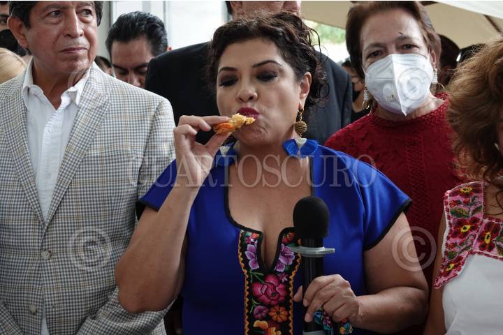 Clara Brugada, alcaldesa de Iztapalapa, degusto un platillo durante la 16a Feria del pescado y Marisco en la Utopía Cuauhtlicalli