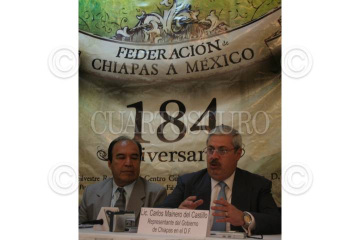 MÉXICO D.F., 28AGOSTO2008.- El Profesor de Conaculta, Alfredo Palacios junto con el representante del Gobierno de Chiapas en el D.F., Carlos Mainero del Castillo, durante la conferencia que se celebró para dar detalles del 184 aniversario de la Federacion de Chiapas y el festival que se realizará en el Centro Cultural Ollin Yoliztli en el D.F. FOTO: ENRIQUE ORDÓÑEZ/CUARTOSCURO.COM