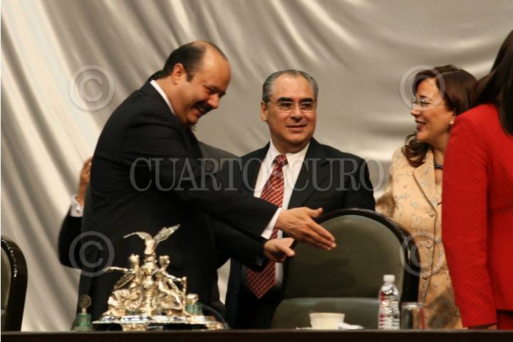 MÉXICO D.F., 25SEPTIEMBRE2008.-Se llevo acabo la sesión solemne en la Cámara de Diputados, donde se develaron con letras de oro en el muro de honor “A las Constituyentes de 1857” esto durante la sesión. en la image el diputado Cesar Duate dialoga con el magistrado José Fernando Franco. FOTO: GUILLERMO PEREA/CUARTOSCURO.COM
