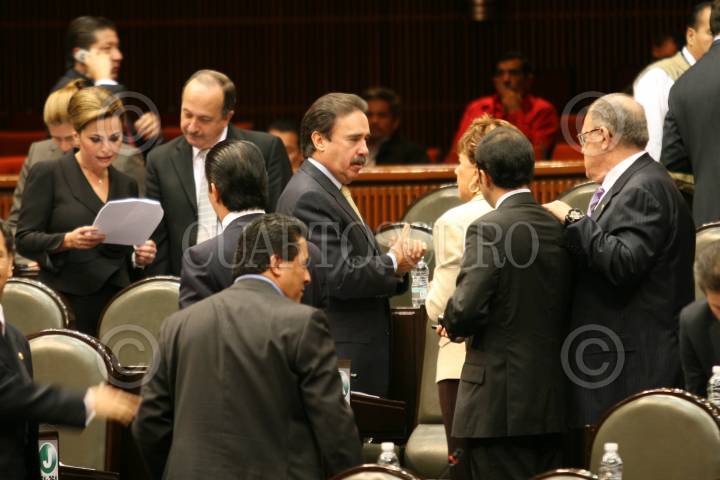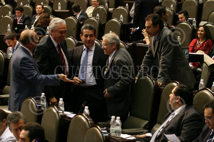 MÉXICO D.F., 25SEPTIEMBRE2008.-Se llevo acabo la sesión solemne en la Cámara de Diputados, donde se develaron con letras de oro en el muro de honor “A las Constituyentes de 1857” esto durante la sesión. En la imagen los diputados del PRD, Raymundo Cardenas y Juan Guerra, dialogan con los diputados del PAN, Diodoro Carrasco, Juan José Rodríguez Prats y Hector Larios. FOTO: GUILLERMO PEREA/CUARTOSCURO.COM